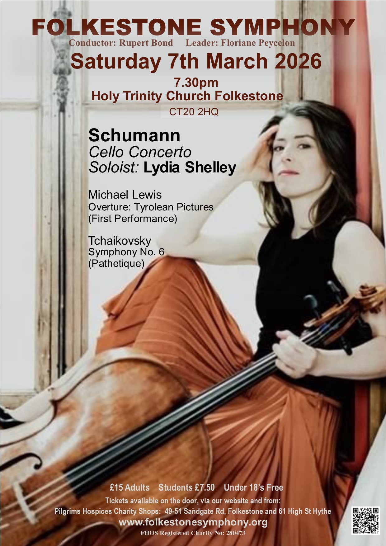 Folkestone Symphony's first concert of 2026 will be on 7th March 2026 at Holy Trinity Church, Sandgate Road, Folkestone CT20 2HQ. The programme includes Schumann's Cello Concerto featuring Lydia Shelley as the soloist.