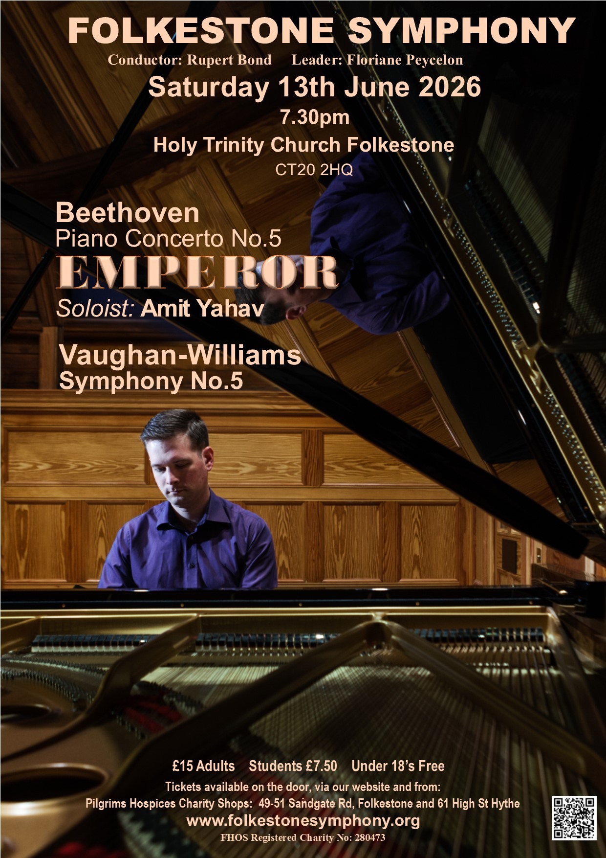 Summer Concert - Saturday, 13th June 2026 at 7.30pm, Holy Trinity Church, Folkestone ![]() ![]() FOLKESTONE SYMPHONY’s next concert on Saturday 13th June, will feature the return of the popular pianist Amit Yahav, who will be performing Beethoven’s wonderful Emperor Concerto. The programme will commence with Mendelssohn’s ‘Calm Sea and Prosperous Voyage’ Overture and conclude with Vaughan Williams’ Symphony No.5. We gratefully acknowledge the support received from the Vaughan Williams Foundation which has enabled us to perform this marvellous work of his on this occasion. |